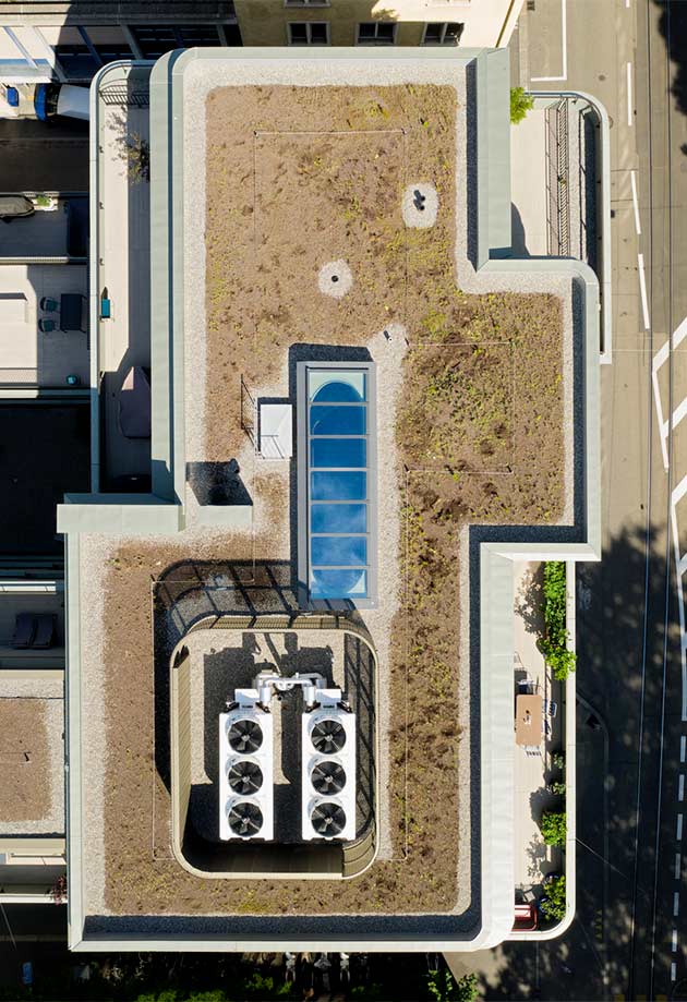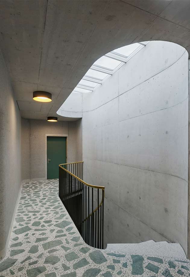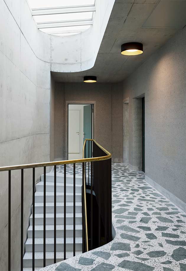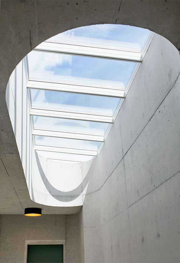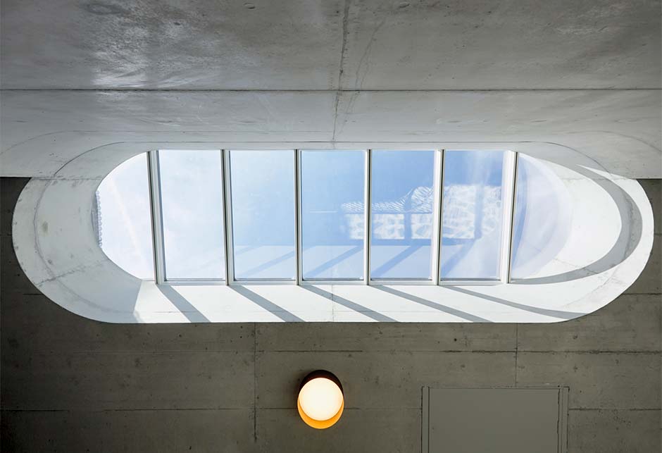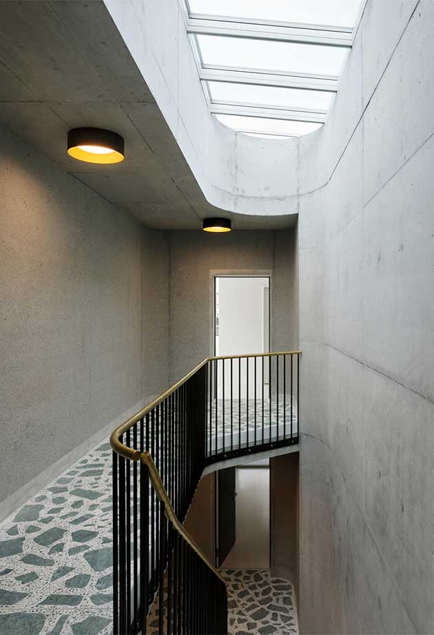 Im Inneren trifft man auf Reduktion und Minimalismus. Das vollständig umschlossene sechsgeschossige Treppenhaus wird ausschliesslich von oben über ein VELUX Modular Skylights-Lichtband belichtet. Dieses wurde sehr flach im 5° Winkel eingebaut und ermöglich somit ein Maximum an Lichtausbeute. Das Lichtband besteht aus sieben Modulen, die exakt über dem Treppenauge platziert wurden. In Kombination mit der schlichten aber hochwertigen Materialwahl entsteht eine sehr sanfte und homogene Lichtstimmung, die je nach Wetter und Sonnenstand variiert.
