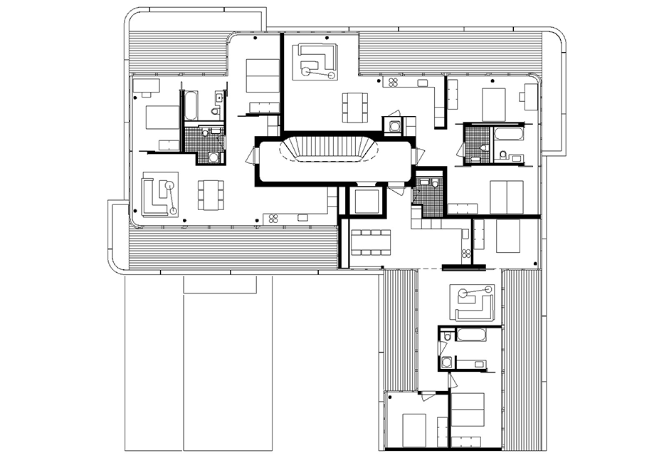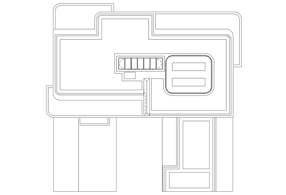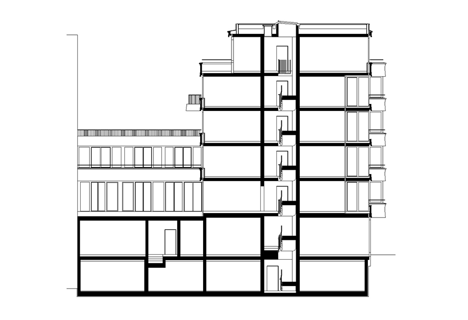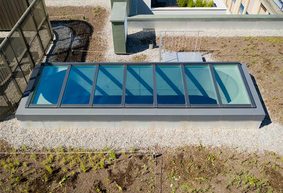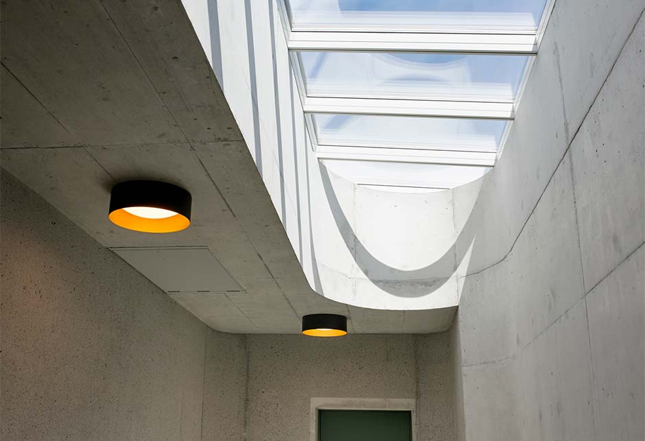 Im Inneren trifft man auf Reduktion und Minimalismus. Das vollständig umschlossene sechsgeschossige Treppenhaus wird ausschliesslich von oben über ein VELUX Modular Skylights-Lichtband belichtet. Dieses wurde sehr flach im 5° Winkel eingebaut und ermöglich somit ein Maximum an Lichtausbeute. Das Lichtband besteht aus sieben Modulen, die exakt über dem Treppenauge platziert wurden. In Kombination mit der schlichten aber hochwertigen Materialwahl entsteht eine sehr sanfte und homogene Lichtstimmung, die je nach Wetter und Sonnenstand variiert.