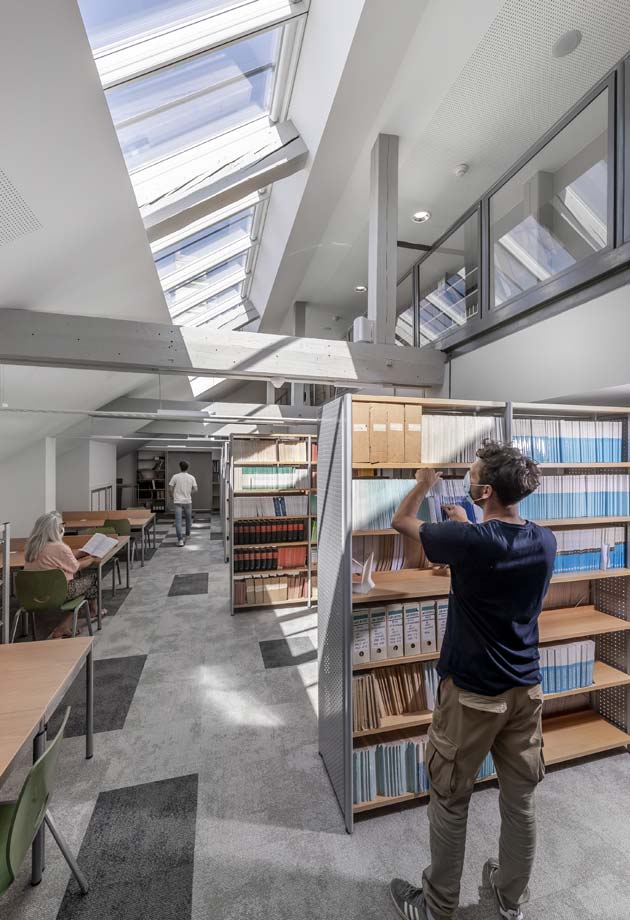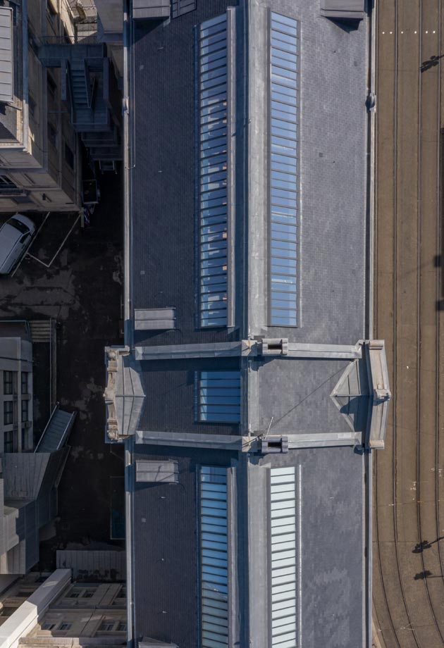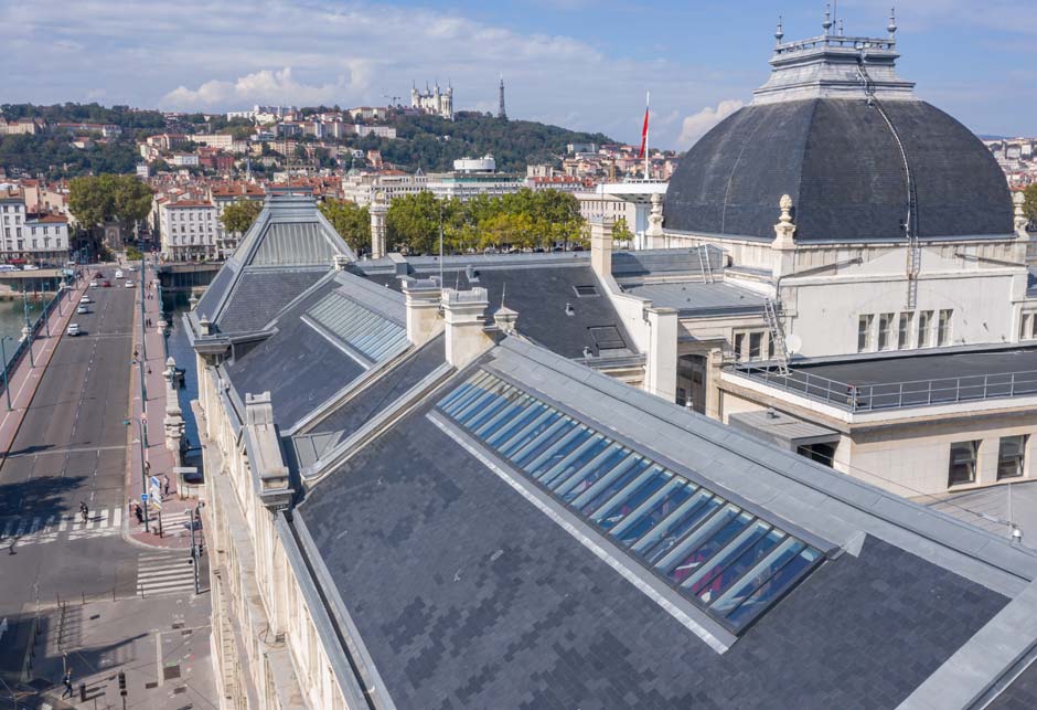 La rénovation de la toiture a nécessité le remplacement des anciennes verrières par de nouvelles, qui devaient respecter un cahier des charges très précis : performances thermiques élevées, intégration parfaite dans le toit, stores intérieurs pour le confort et désenfumage pour la sécurité des personnes.