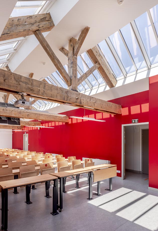 La solution retenue est un ensemble de plusieurs verrières de la solution Verrière Modulaire VELUX, qui répondait à l’ensemble des critères du cahier des charges, en plus d’une intégration harmonieuse dans les toits de l’université.